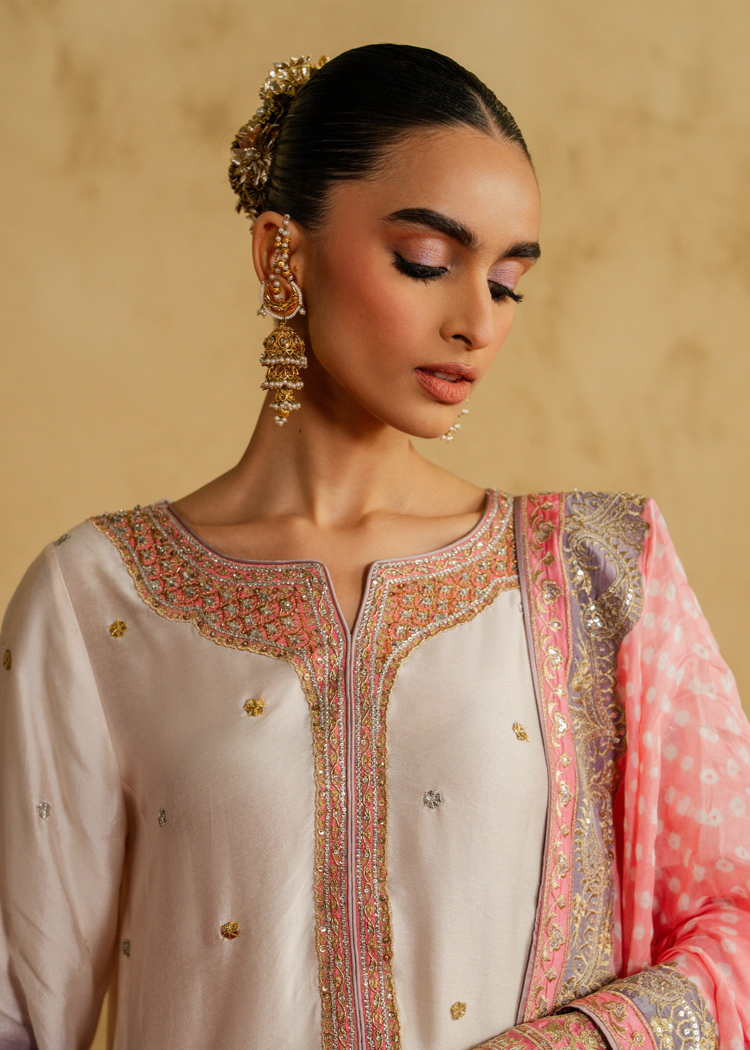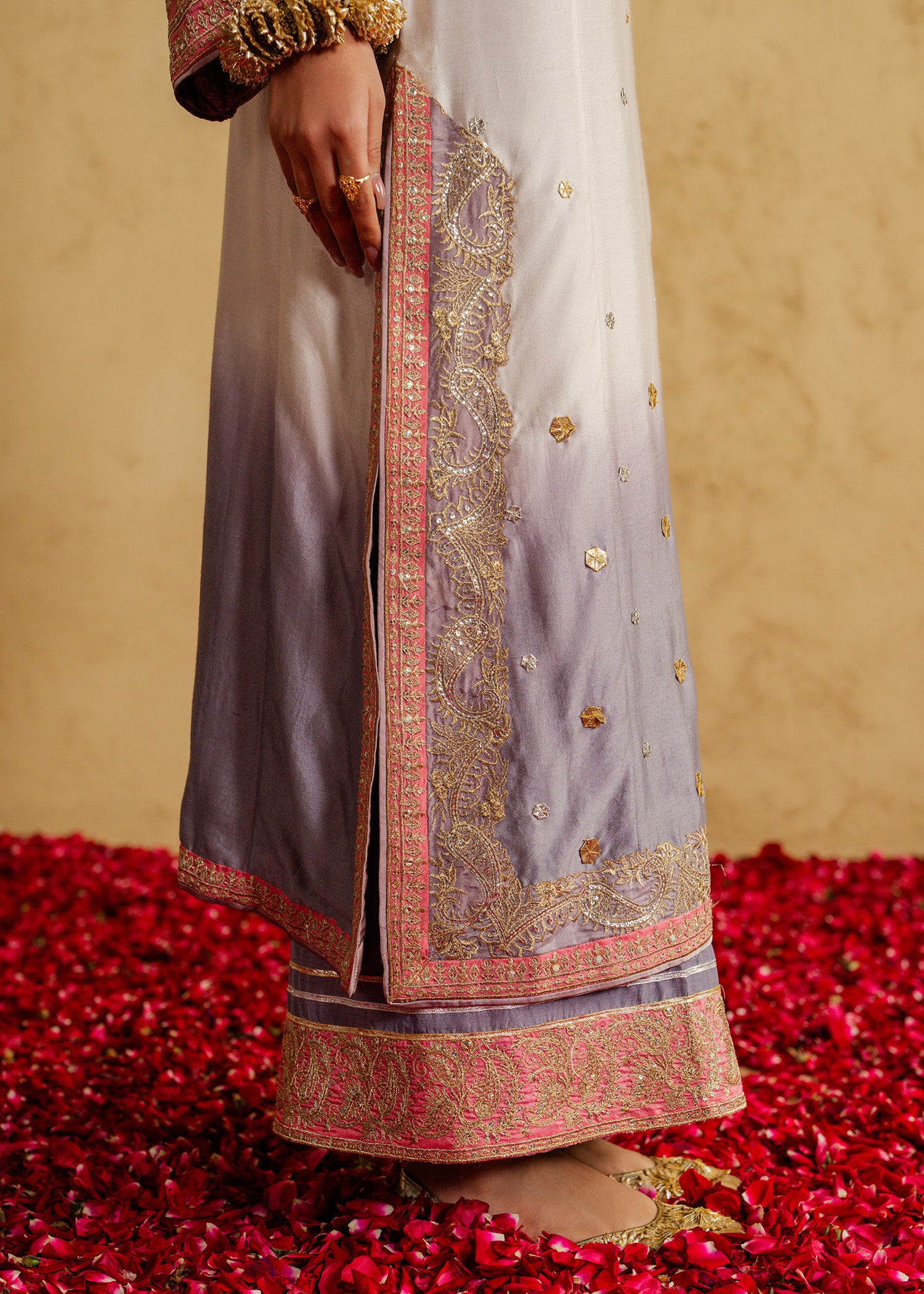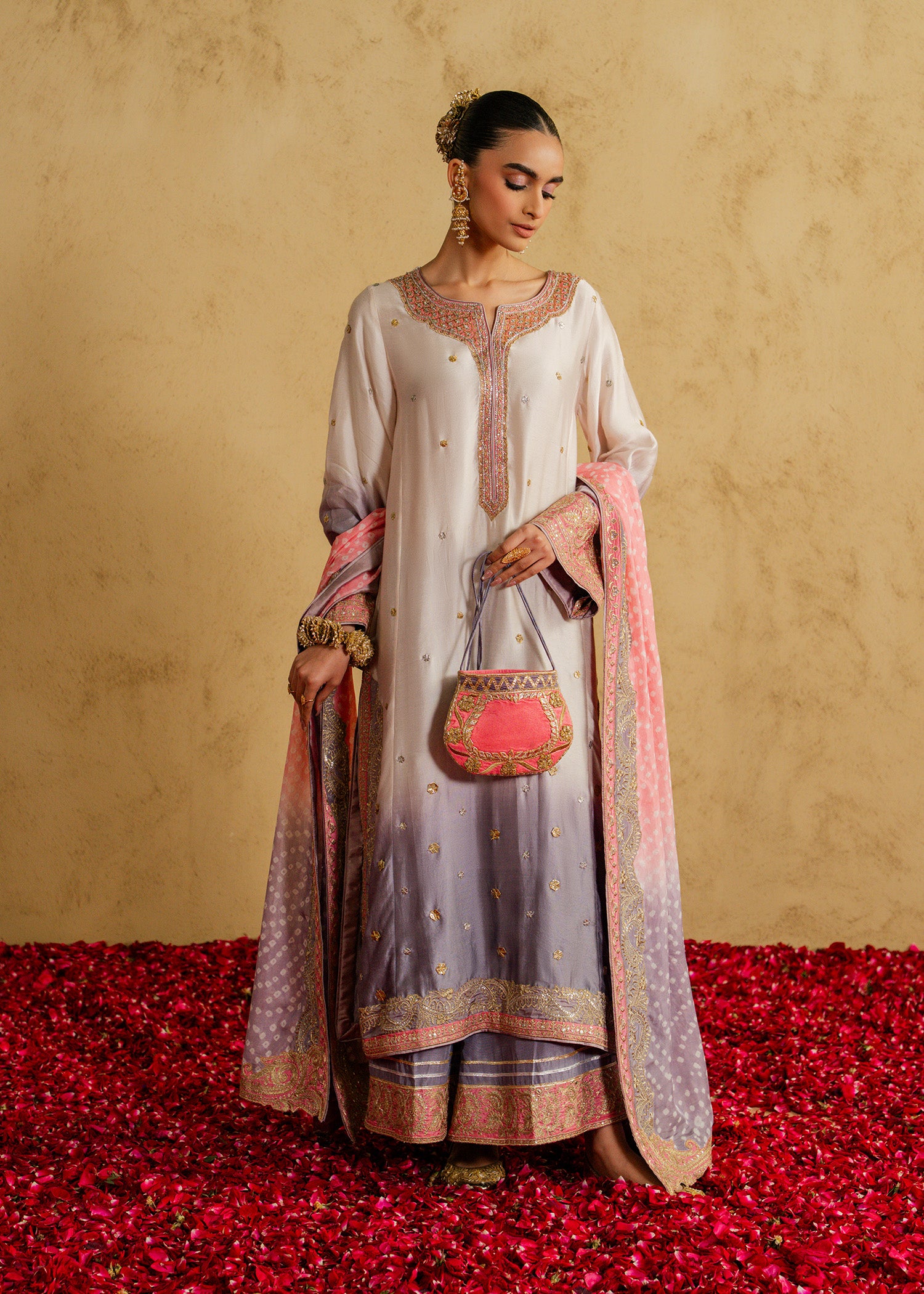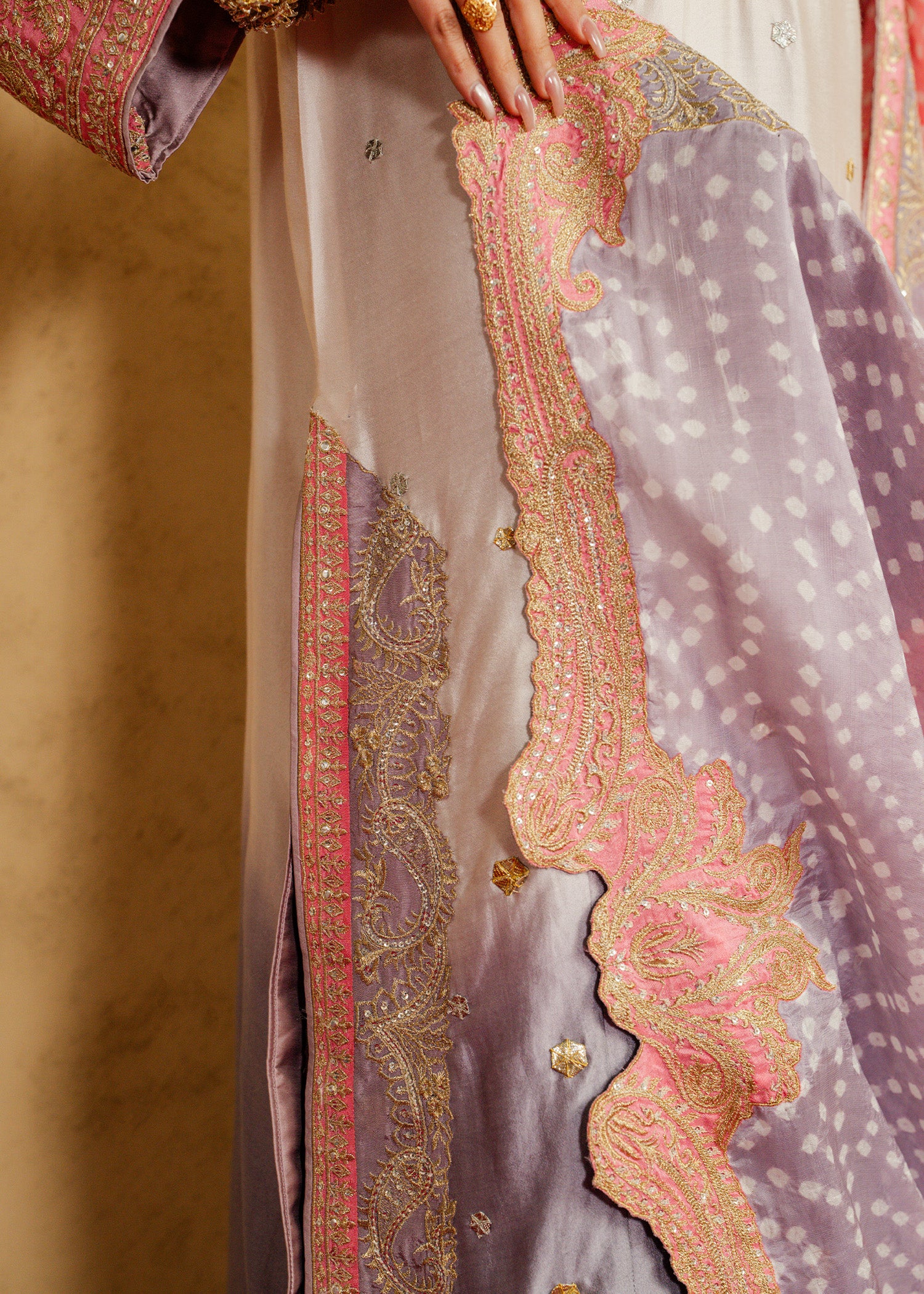 Indigo Myst, a soft lilac luxury pret ensemble crafted in Karandi silk for the shirt and Korean silk for the trousers, paired with a flowing silk dupatta. Elegant, graceful, and effortlessly chic, it’s perfect for festive gatherings or stylish evening affairs. Subtle yet striking, Indigo Myst brings a touch of modern sophistication to every occasion.