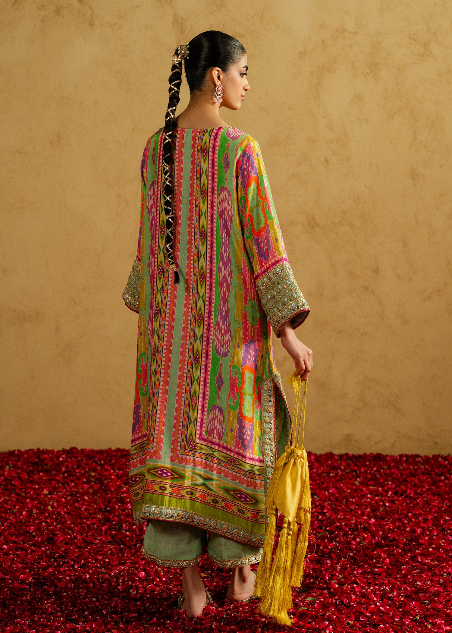 Petal Whisper — a vibrant multicolored ensemble crafted in soft Korean silk for both shirt and trouser. Light, comfortable, and effortlessly elegant, it’s perfect for festive gatherings or casual chic evenings. With its playful mix of colors, Petal Whisper brings a subtle, modern charm to every look.