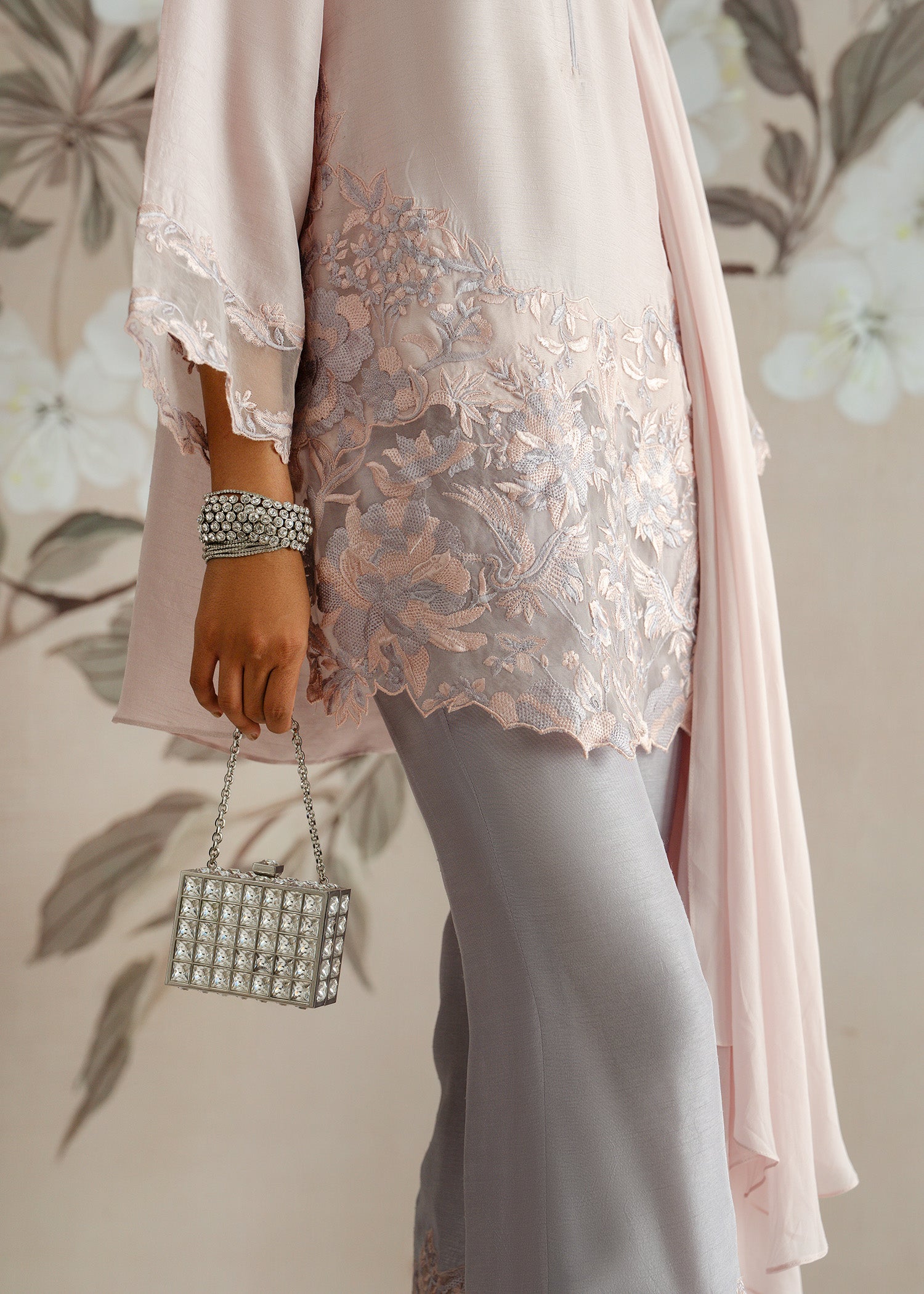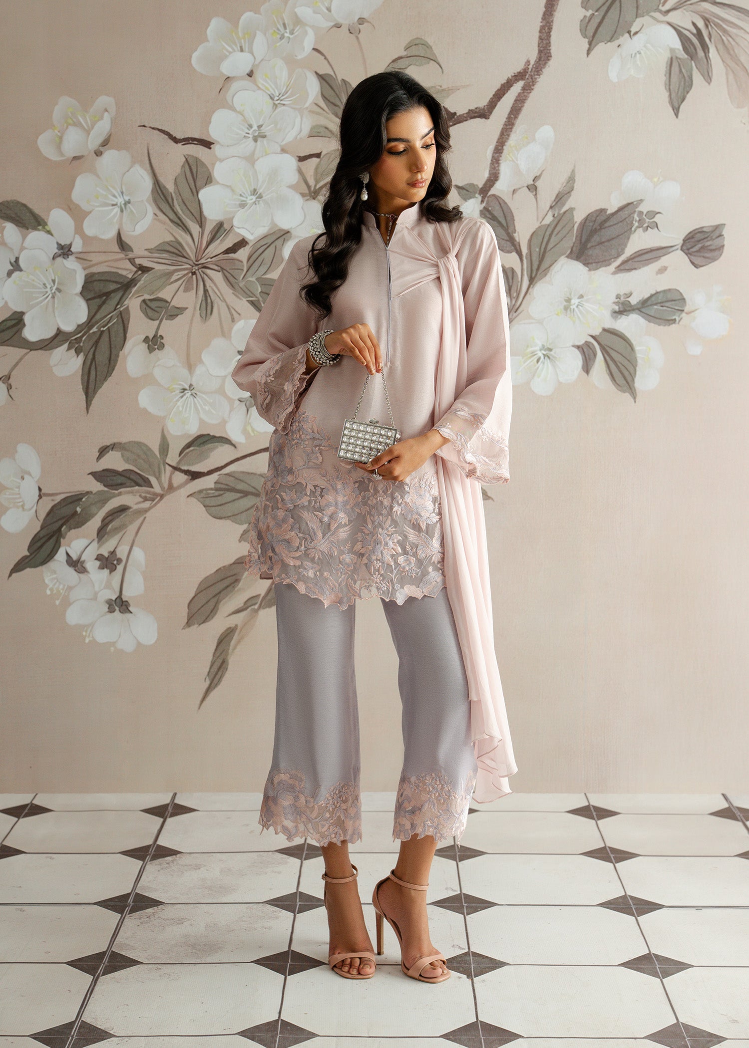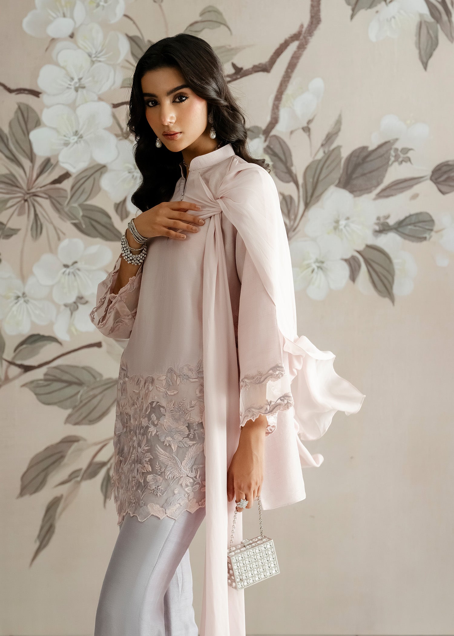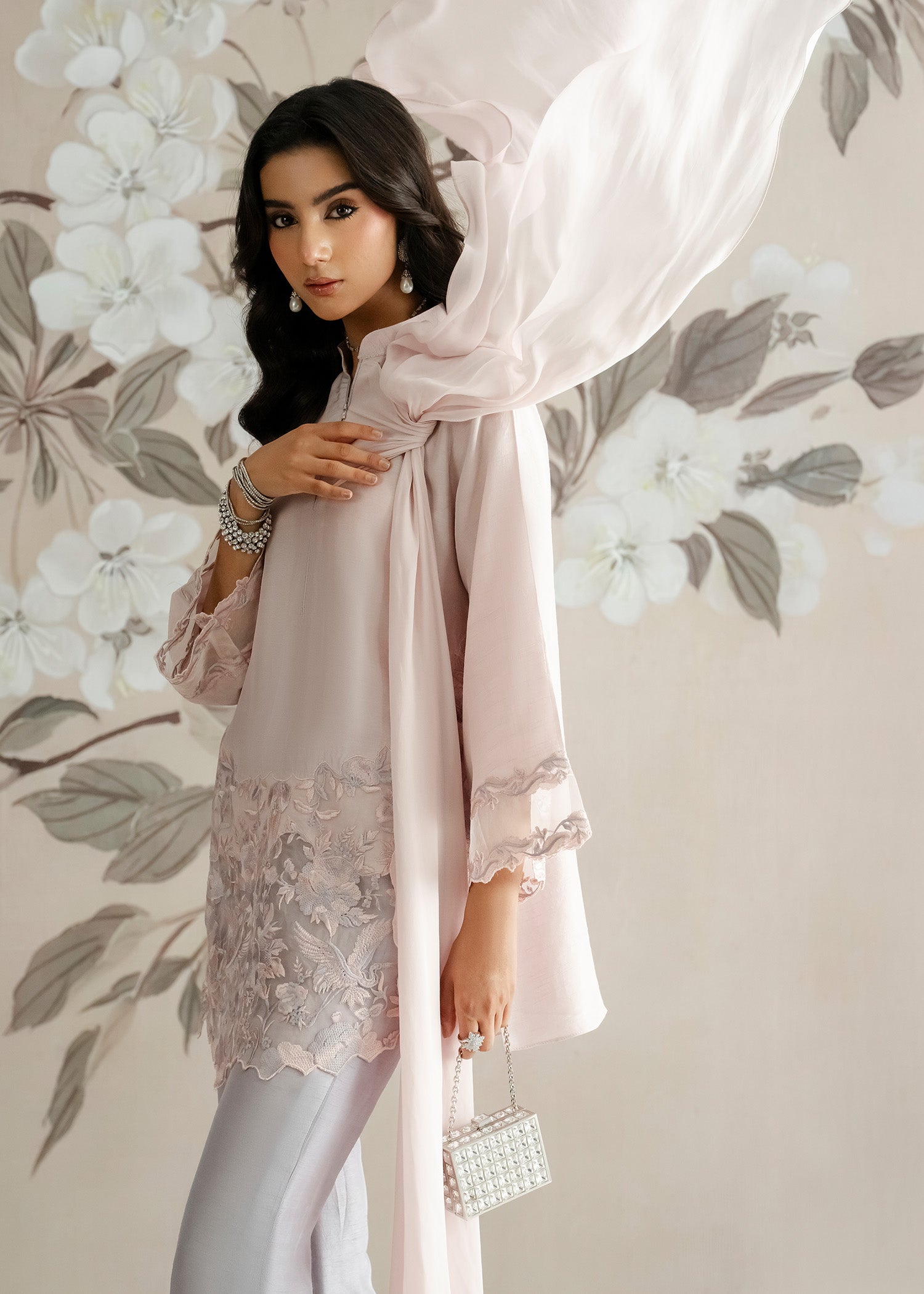 Crafted in luxurious Korean raw silk, the kurti and trousers reflect a poetic blend of femininity and refinement. A timeless luxury pret look for those who adore subtle romance in every stitch.