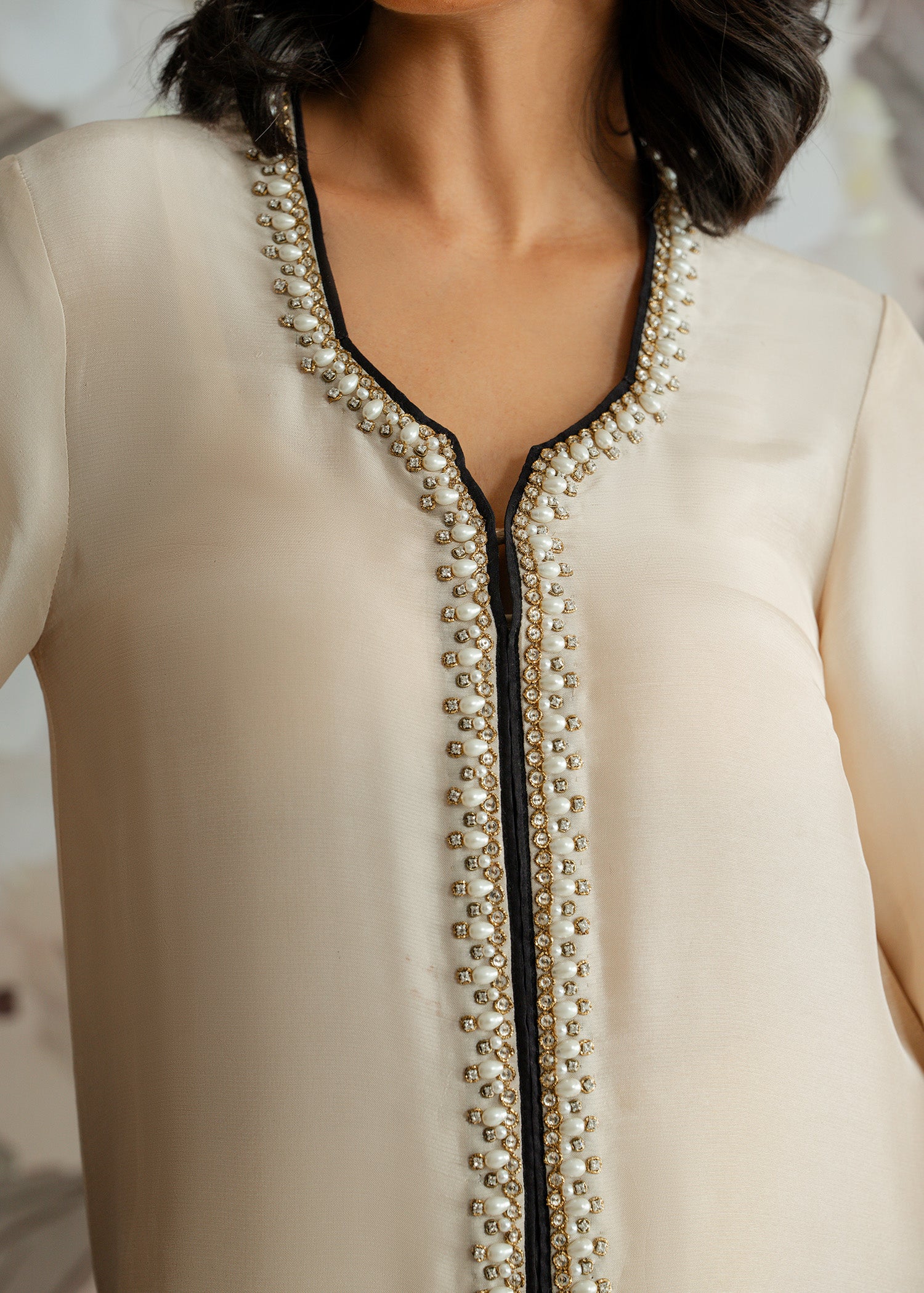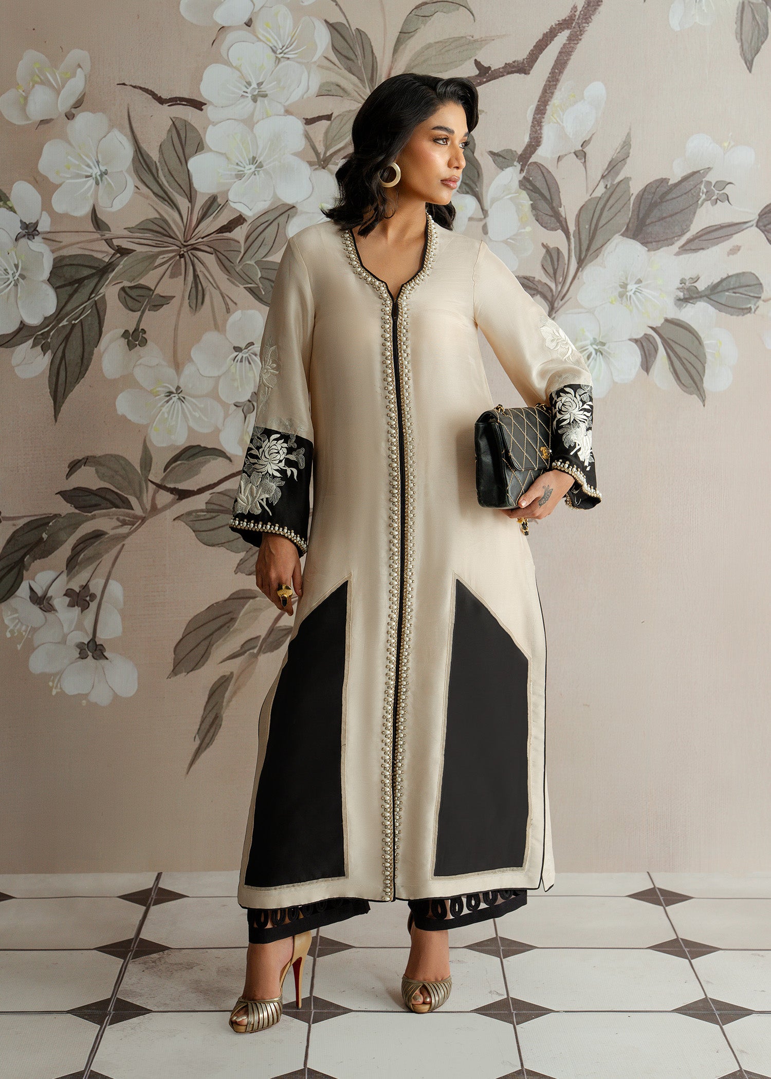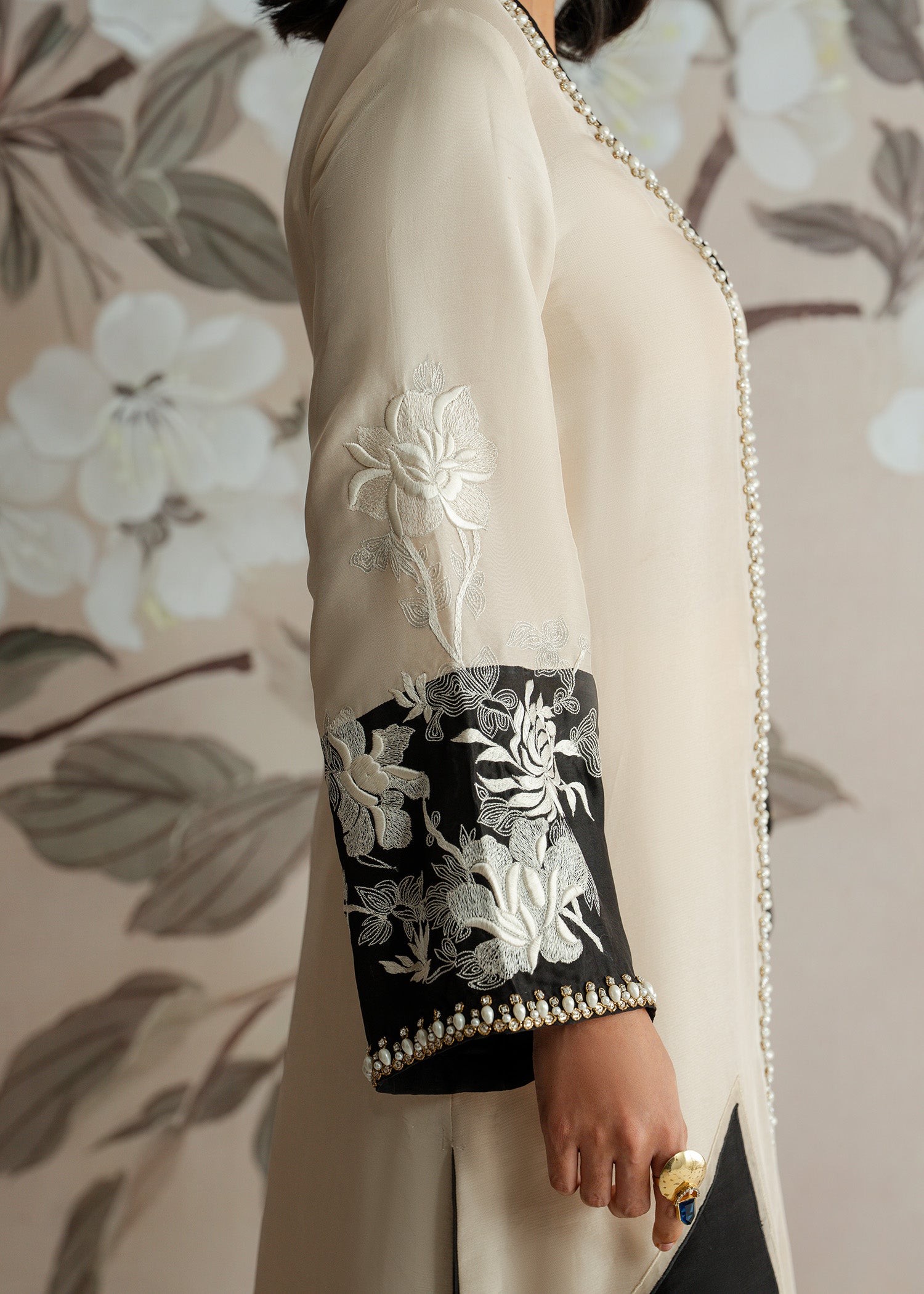 A tale of quiet opulence in soft beige tones..Tailored from premium Korean raw silk, the long shirt and trousers exude refined minimalism with an effortlessly graceful silhouette. A timeless piece that speaks of poise, elegance, and contemporary charm.