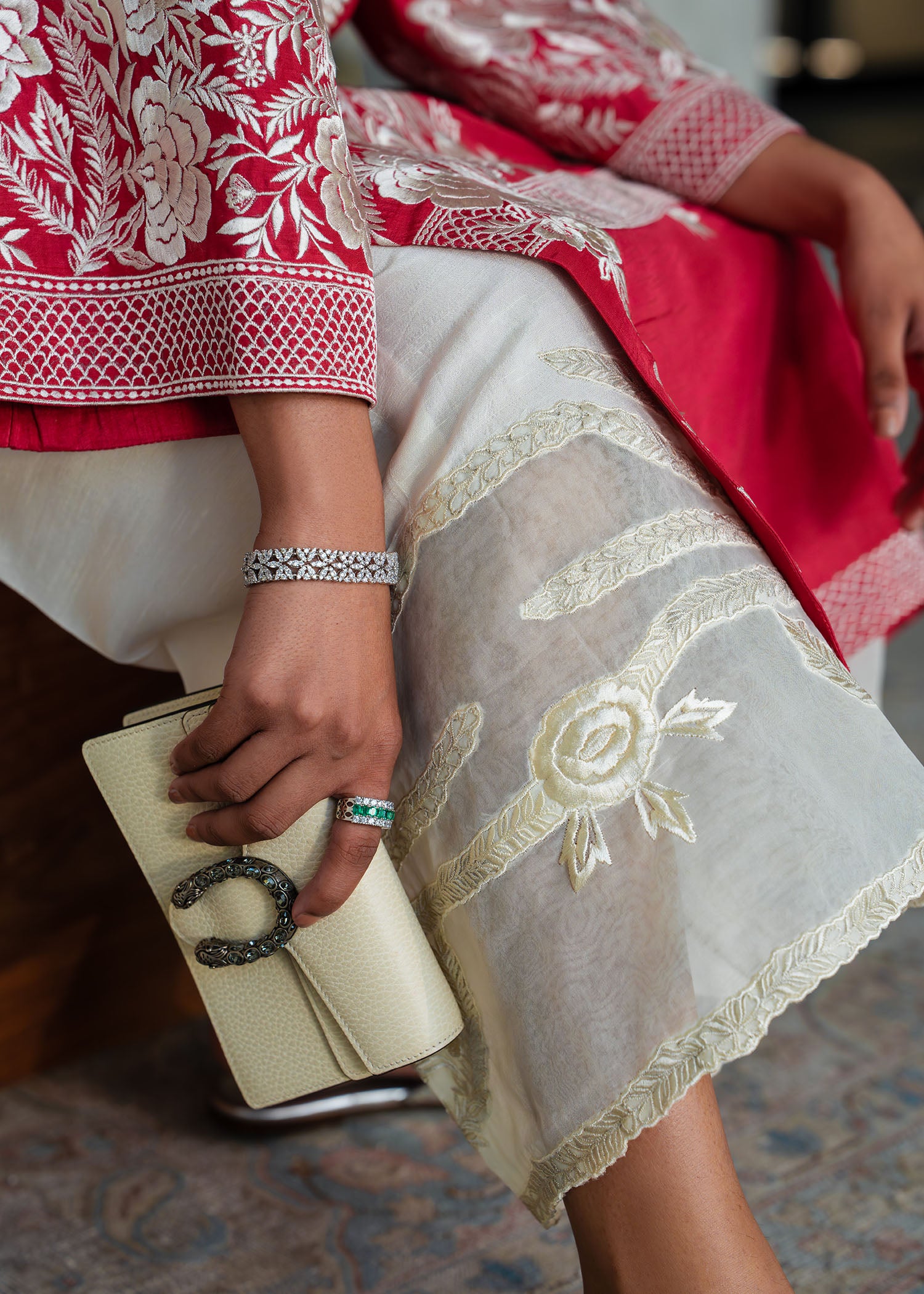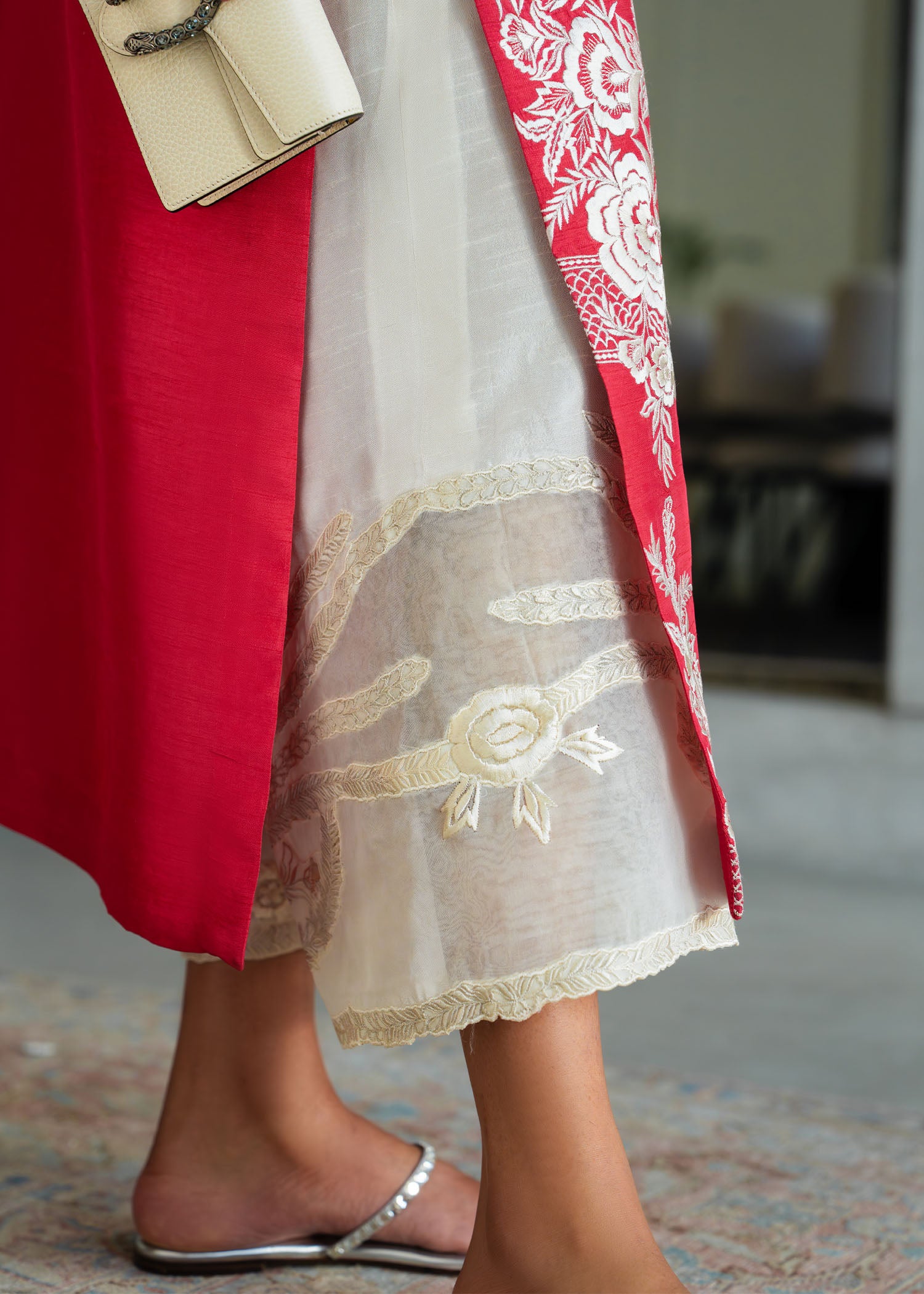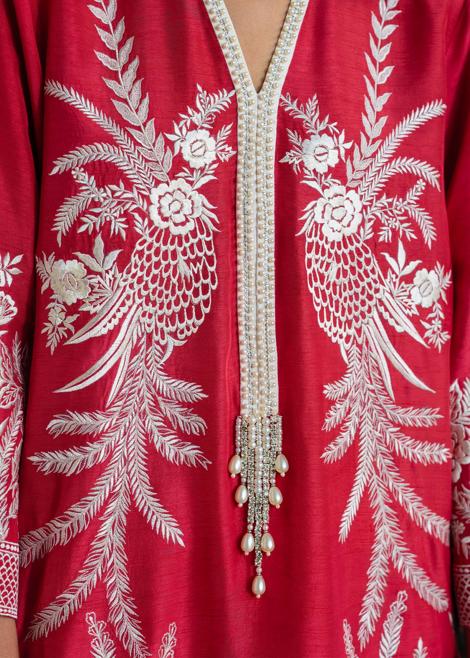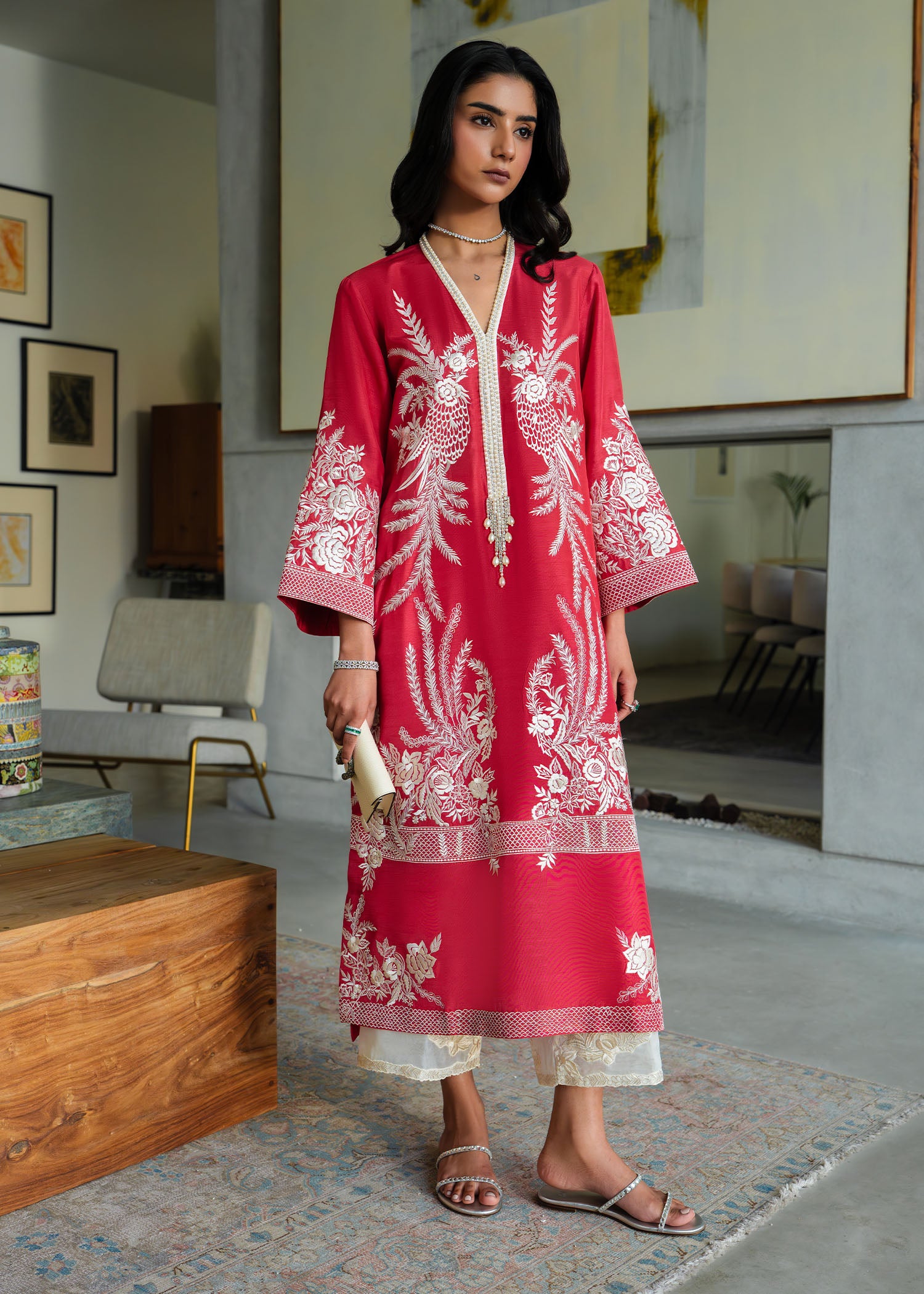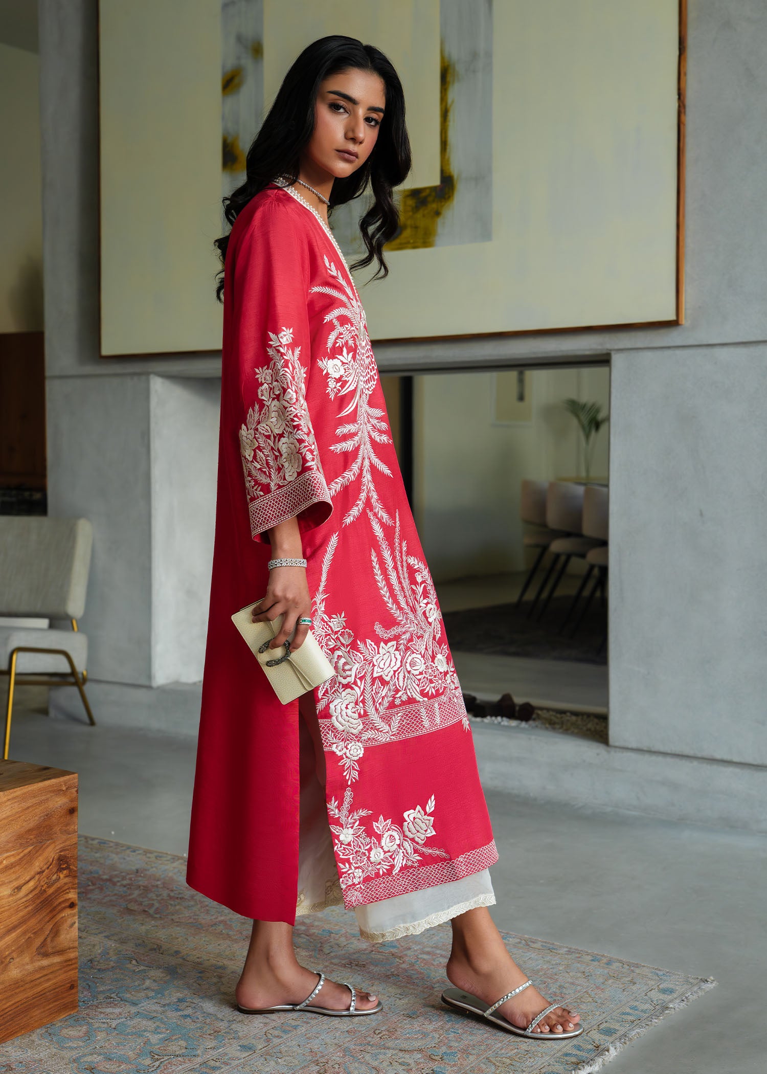 Step into a world of radiant elegance with Coral Majesty, a coral-hued Luxury Pret ensemble in luxurious Korean silk. The flowing shirt paired with tailored trousers creates a silhouette that is both regal and effortless, celebrating bold sophistication with every fold. Perfect for festive soirées, intimate gatherings, or moments where statement elegance is everything.