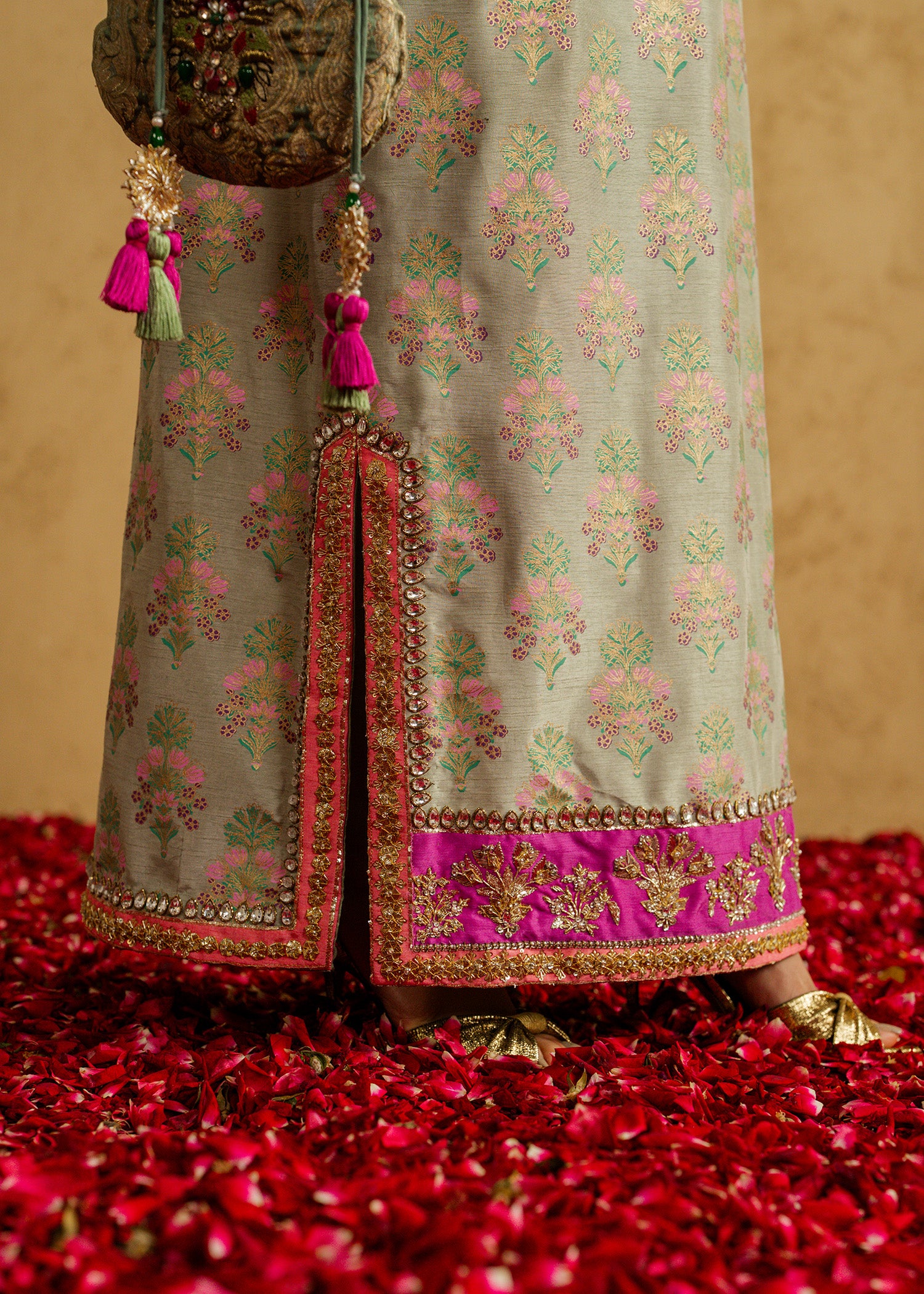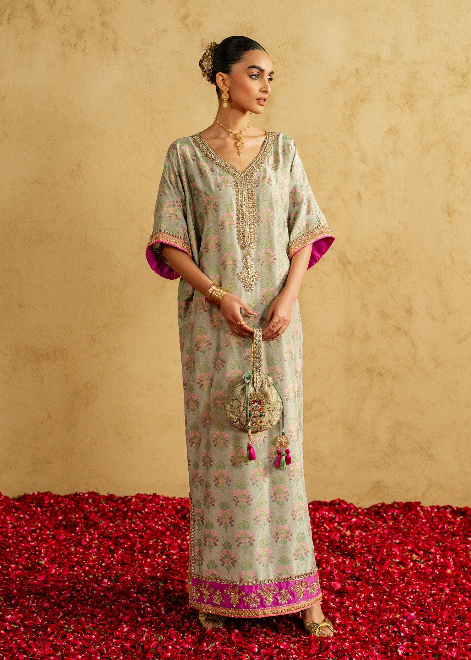 Serene in mint green, Hazel is a luxury pret kaftan crafted in fluid Korean silk. Its flowing silhouette combines comfort with effortless sophistication, creating a look that is both graceful and contemporary. Perfect for festive gatherings or chic evenings, Hazel embodies timeless elegance, subtle charm, and modern luxury