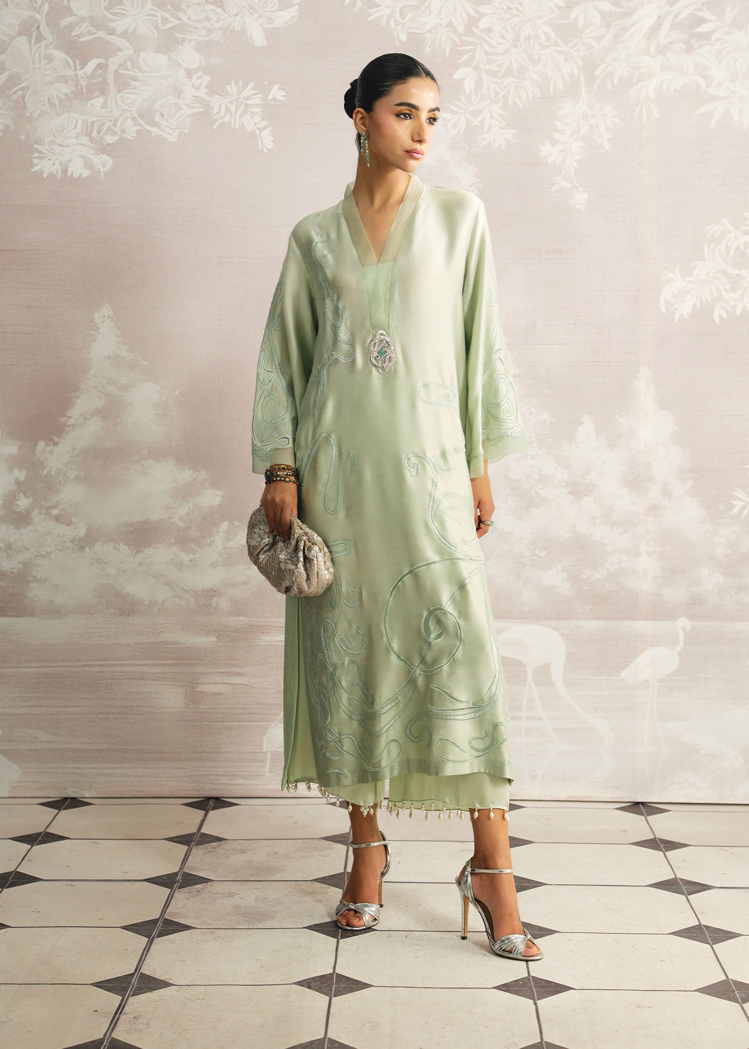 Graceful and effortlessly chic, Ruzan radiates in a serene sage green, where the richness of karandi silk meets the smooth sophistication of satin trousers. Accented with a hand-embellished neckline and paired with a flowing chiffon plain spray dupatta, this Luxury Pret ensemble is a perfect harmony of elegance, artistry, and modern refinement.