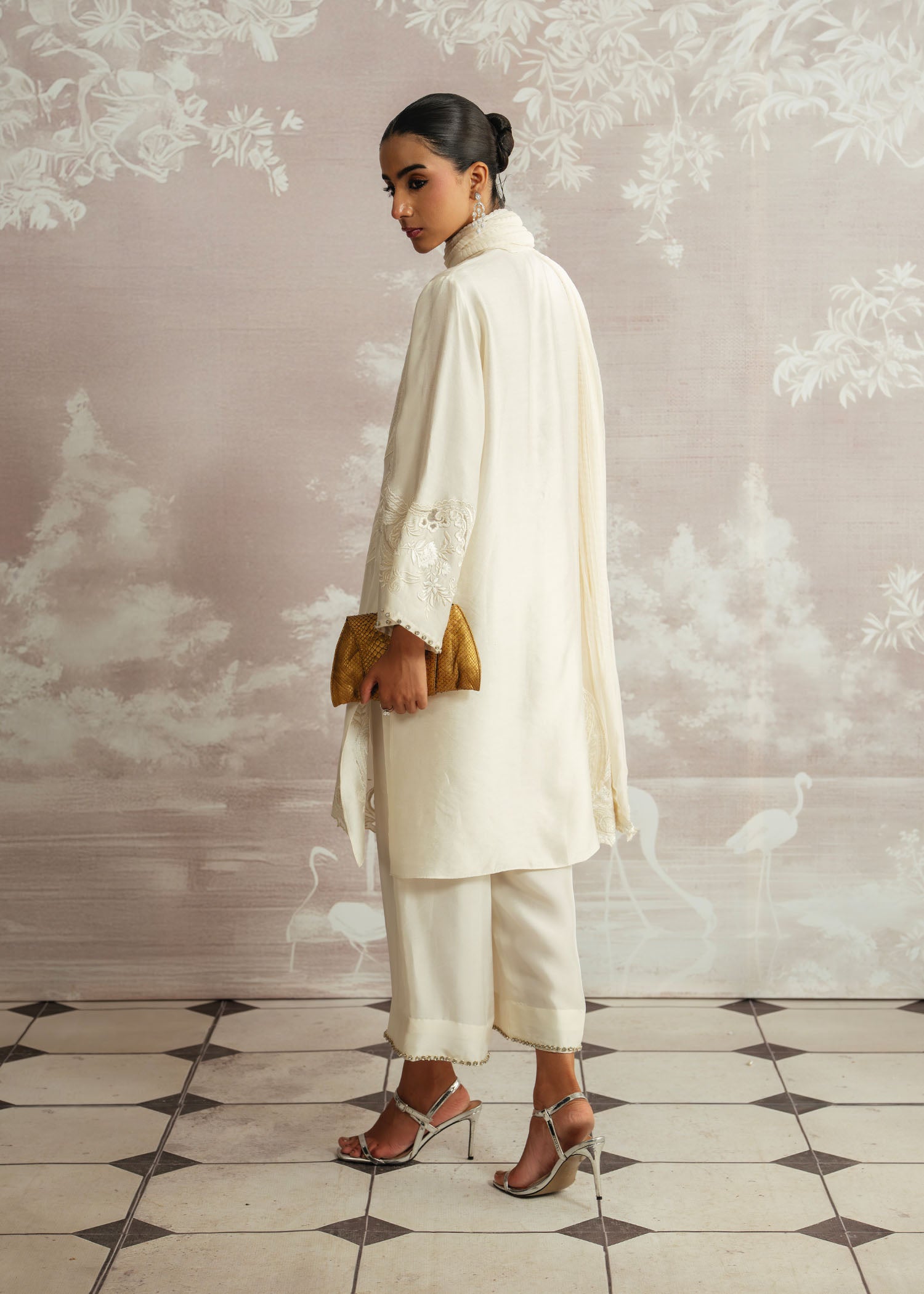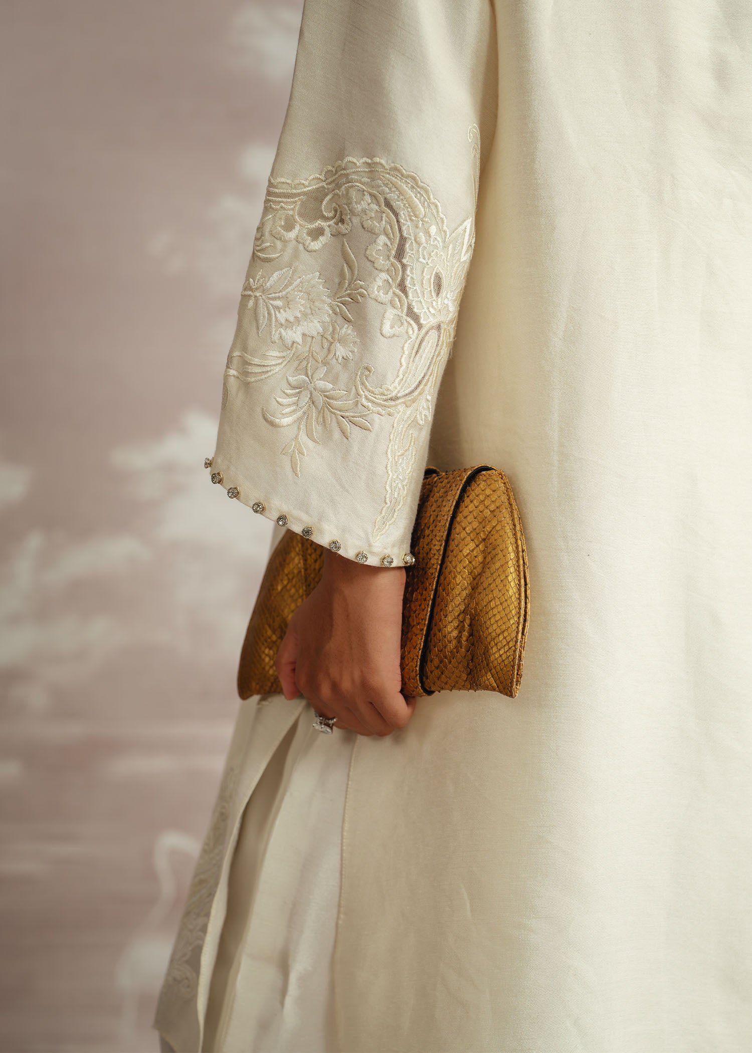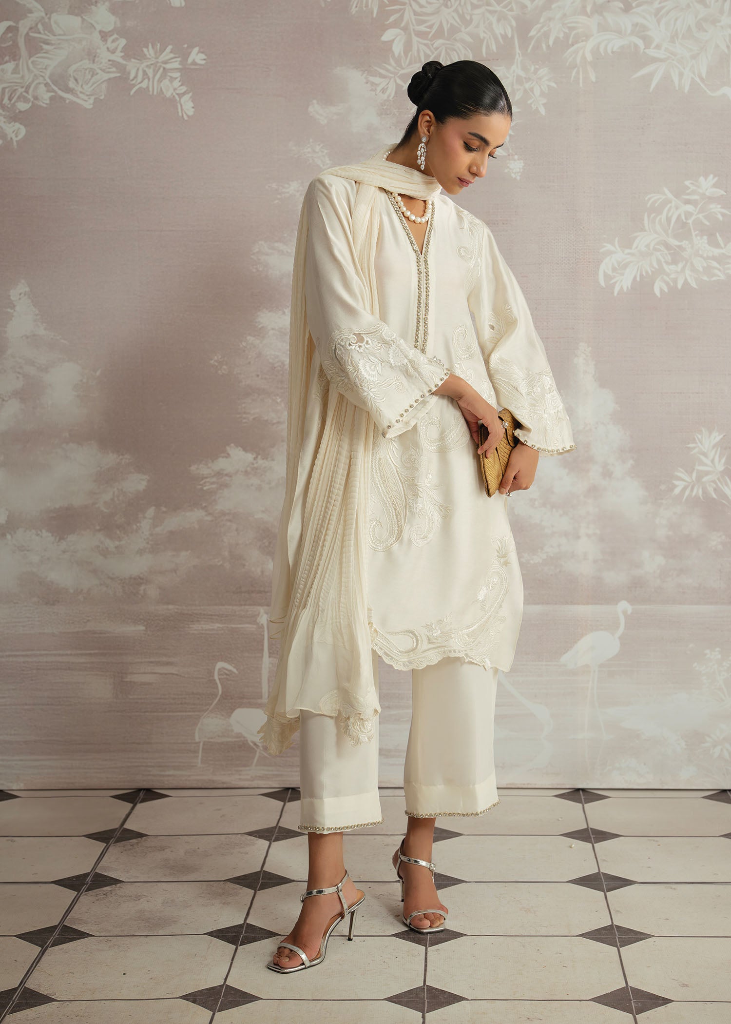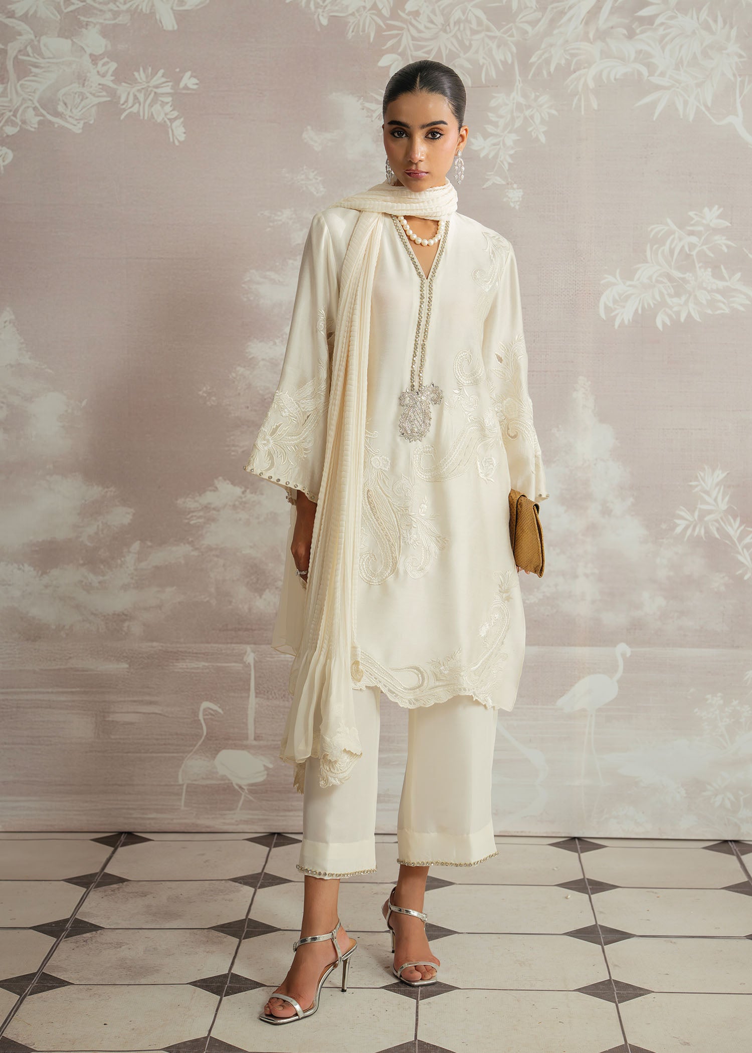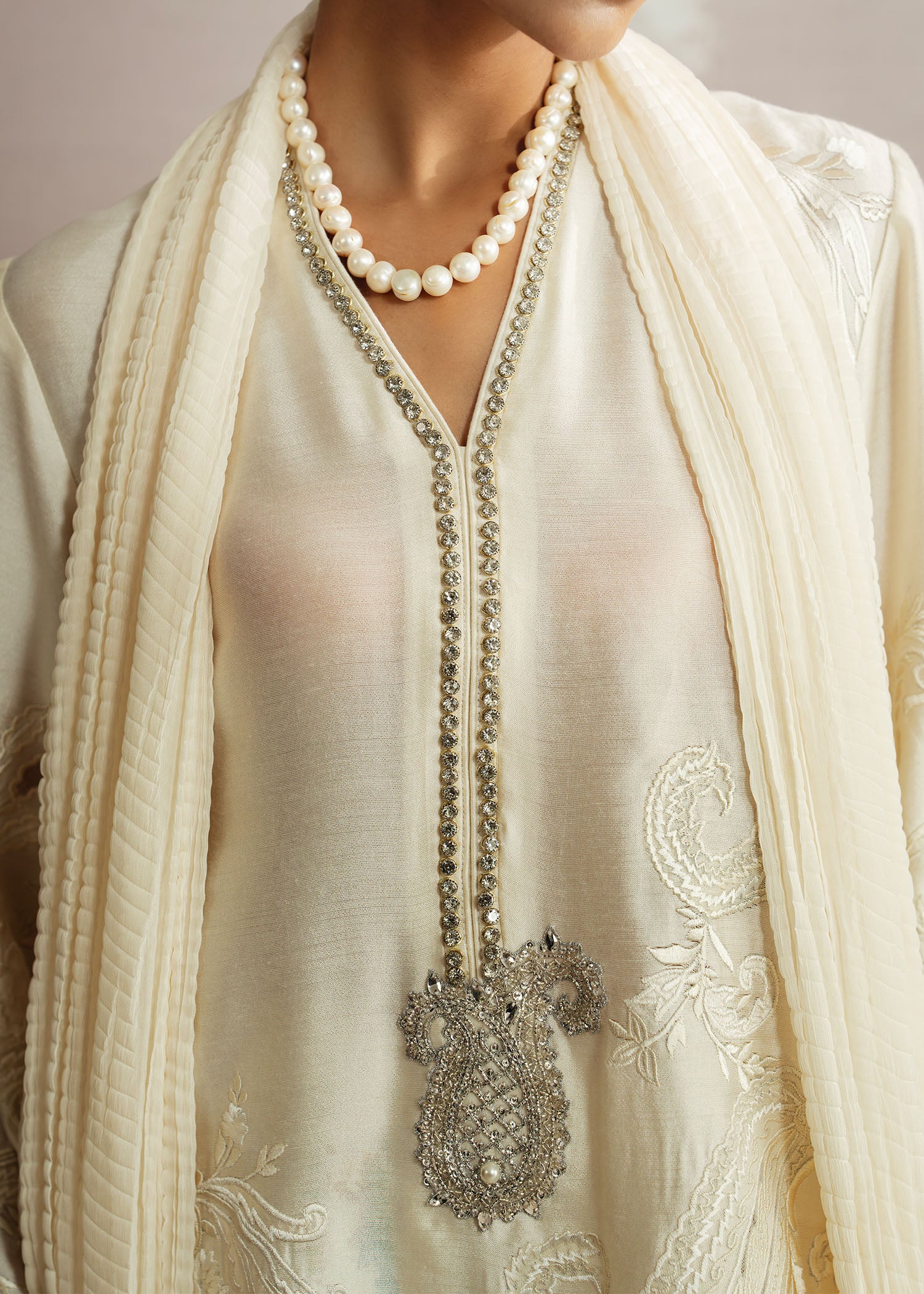 A vision of timeless elegance, Safa is rendered in a soft ivory palette, exuding understated luxury. Crafted with a karandi silk shirt and paired with rich raw silk trousers, the ensemble is elevated by a delicately hand-embellished neckline. Finished with a flowing chiffon plain spray dupatta, this Luxury Pret look is designed for graceful moments where refinement speaks volumes.