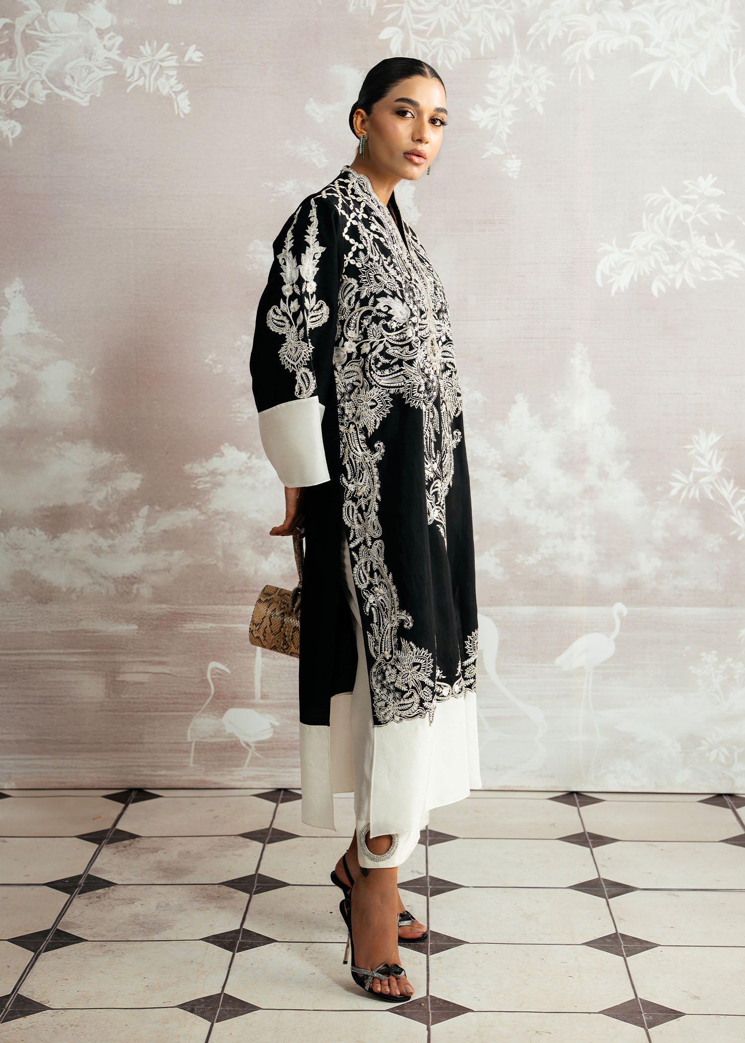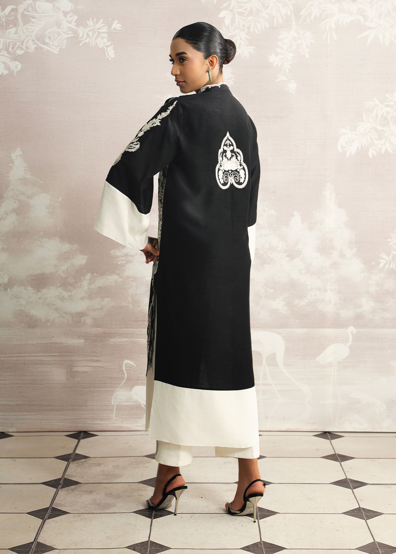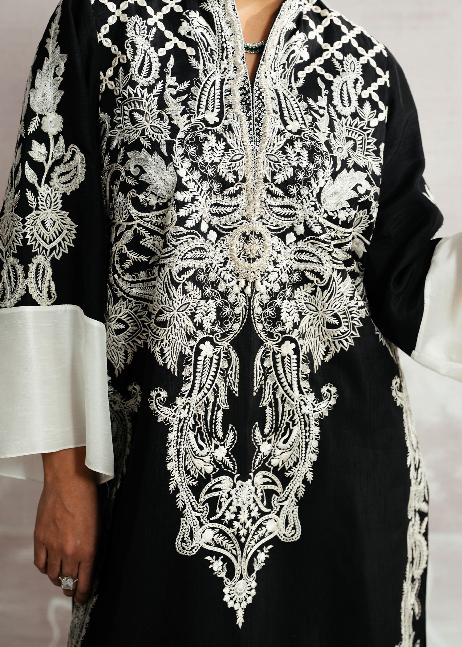 Bold, elegant, and effortlessly refined, Layl shines in deep black Korean silk, with both shirt and pants exuding a sleek, modern silhouette. The hand-embellished neckline adds a touch of artisanal sophistication, beautifully complemented by a flowing plain spray dupatta. A Luxury Pret ensemble that defines contemporary elegance with timeless allure.