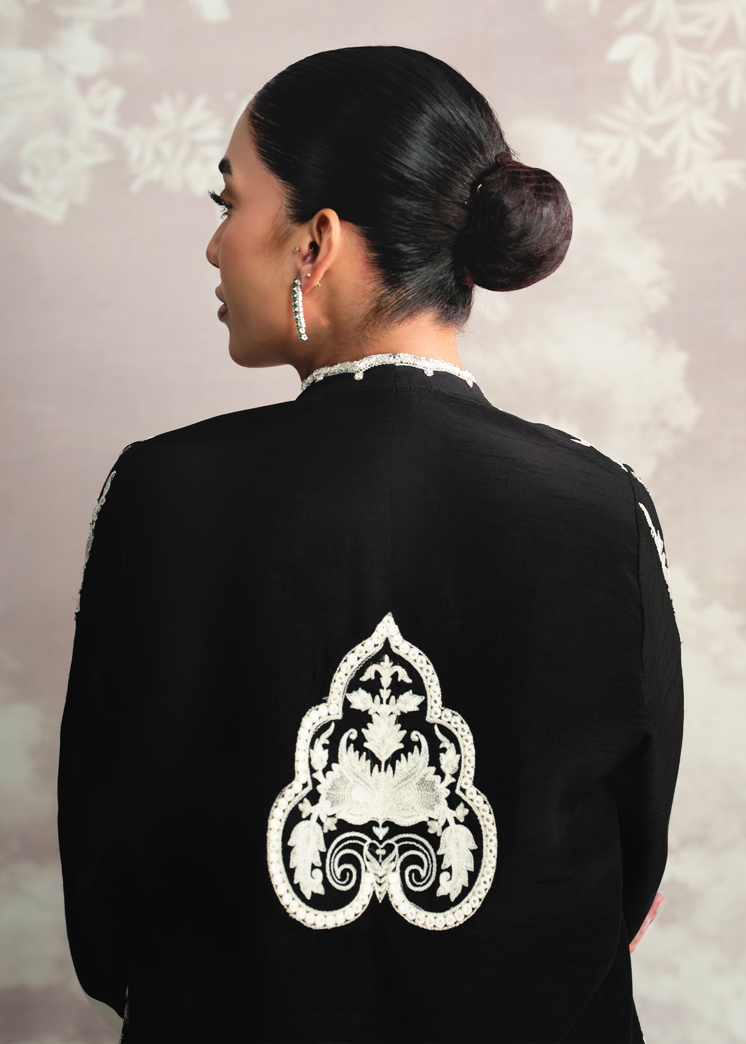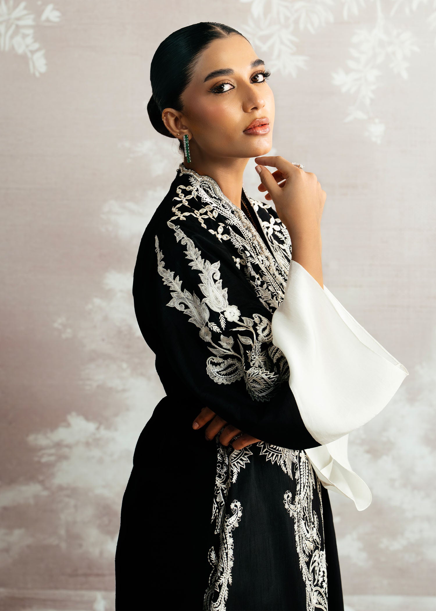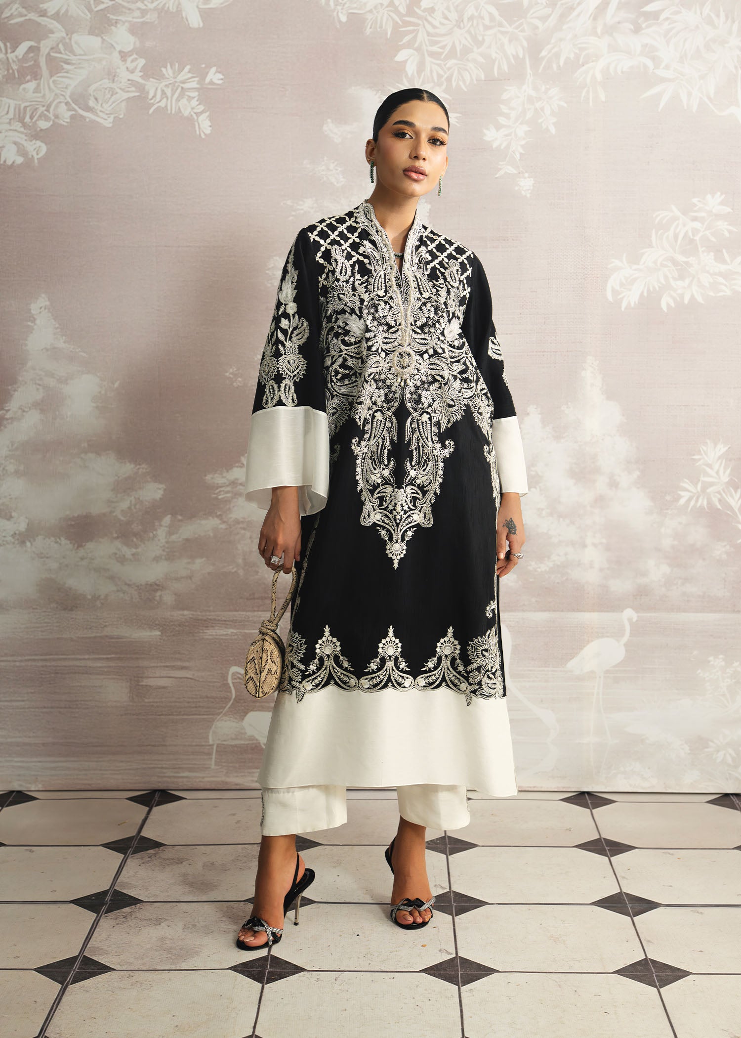 Bold, elegant, and effortlessly refined, Layl shines in deep black Korean silk, with both shirt and pants exuding a sleek, modern silhouette. The hand-embellished neckline adds a touch of artisanal sophistication, beautifully complemented by a flowing plain spray dupatta. A Luxury Pret ensemble that defines contemporary elegance with timeless allure.