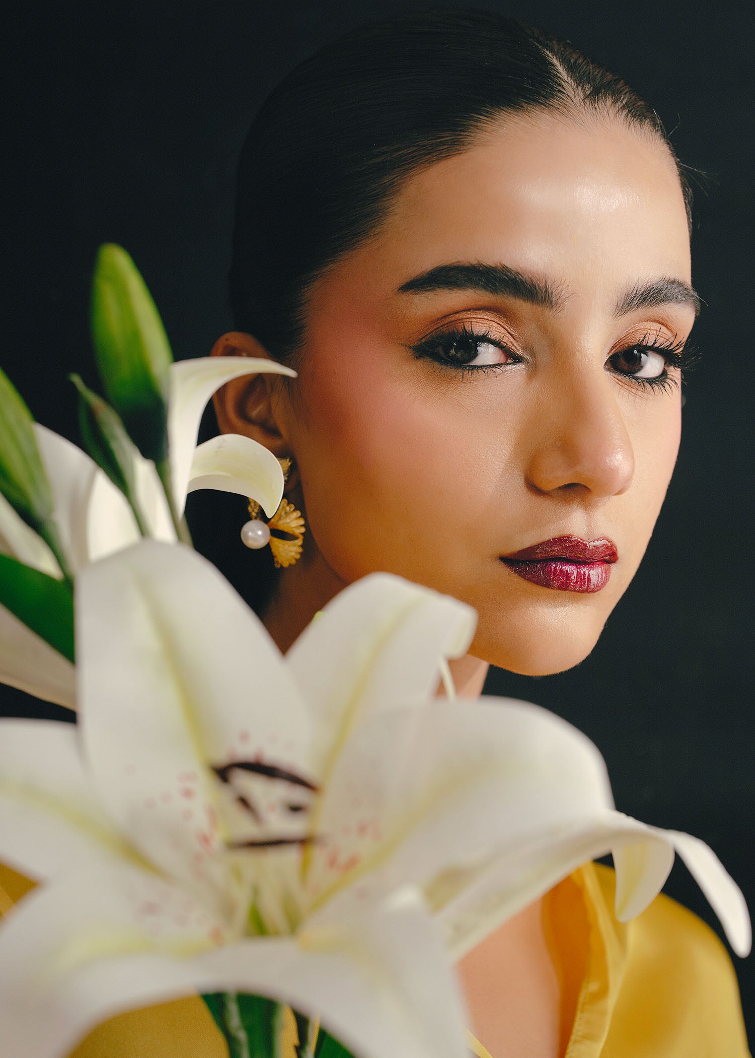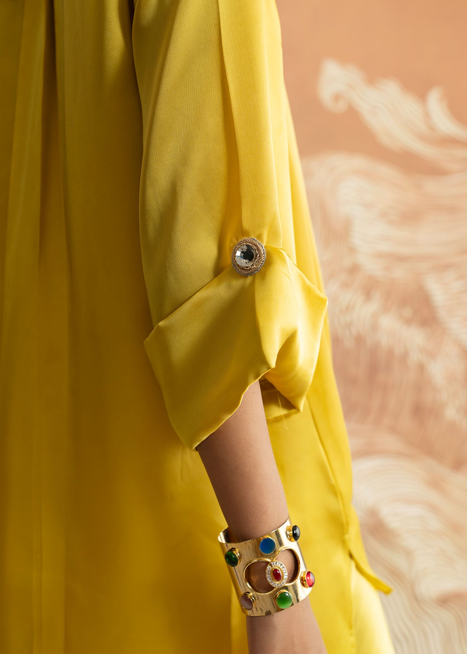 In luminous yellow satin, this kurti and trouser set radiates joy and warmth; with a touch of hand embellishment, infusing the vibrant hue with an elegance that feels both graceful and enduring.