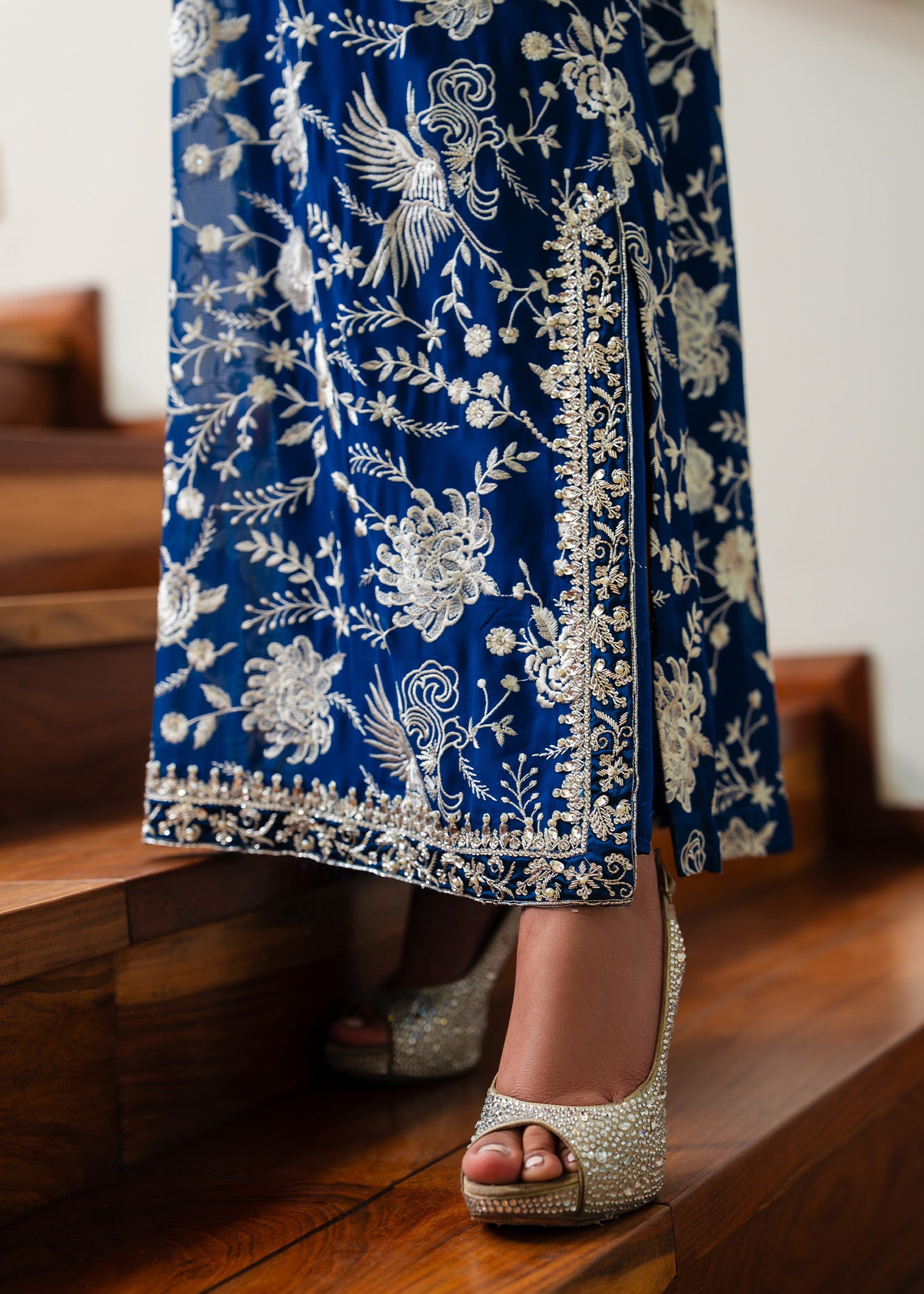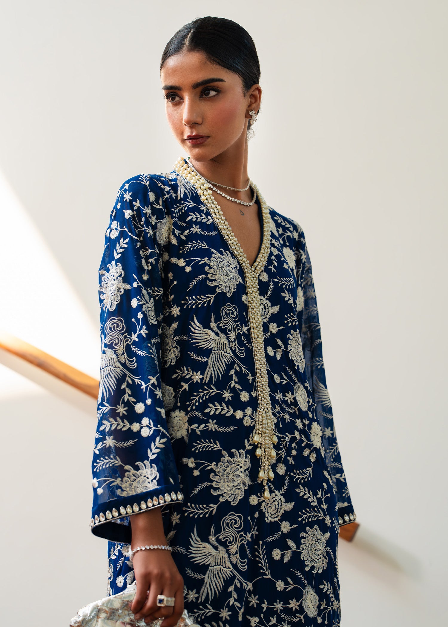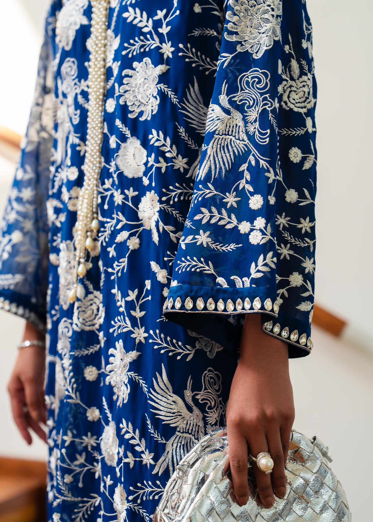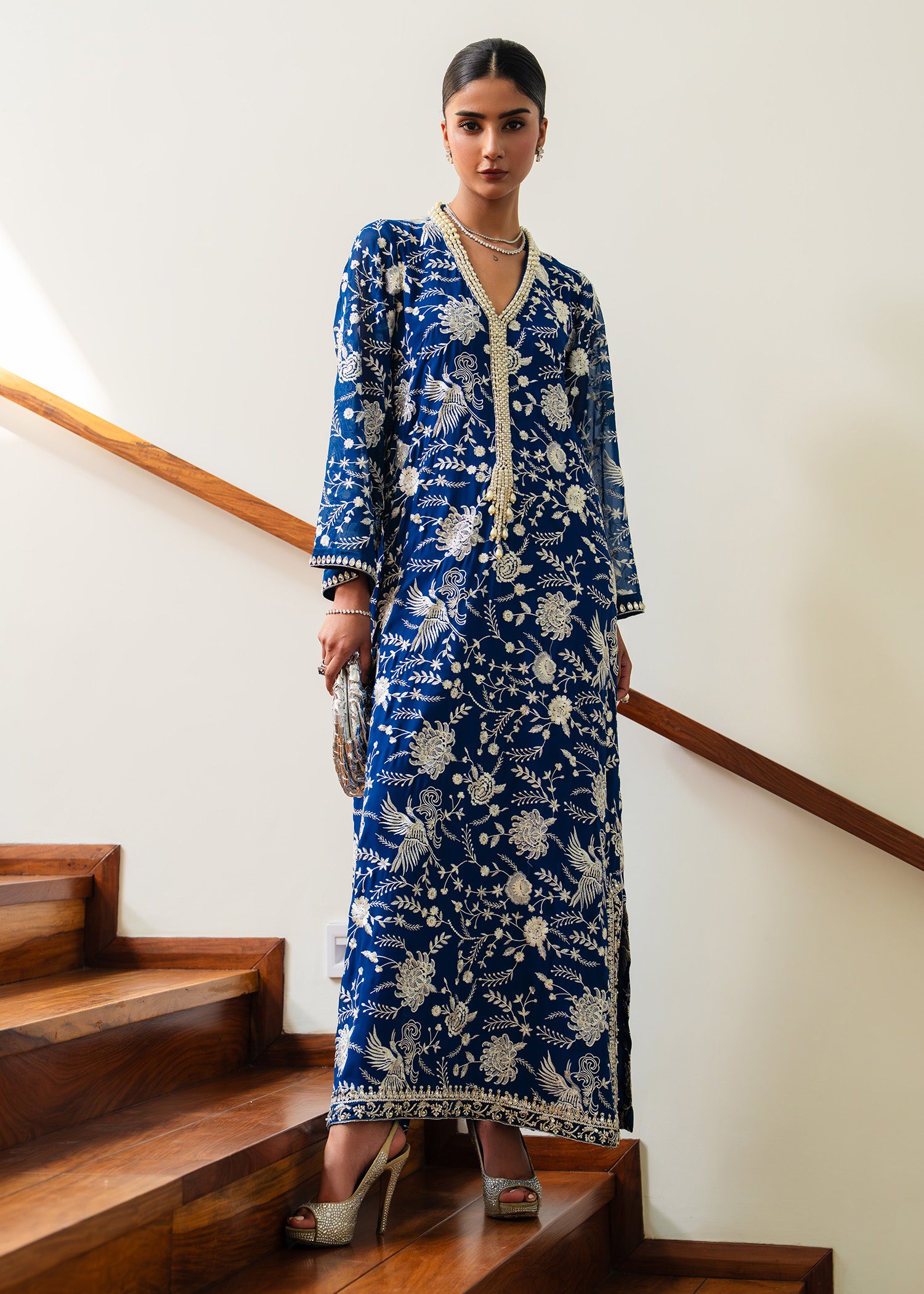 Drape yourself in serenity with Zavia, a blue chiffon kaftan designed for modern luxury. Its fluid silhouette and airy fabric evoke ethereal charm, making it ideal for festive gatherings, evening affairs, or any occasion where elegance must speak louder than words.
